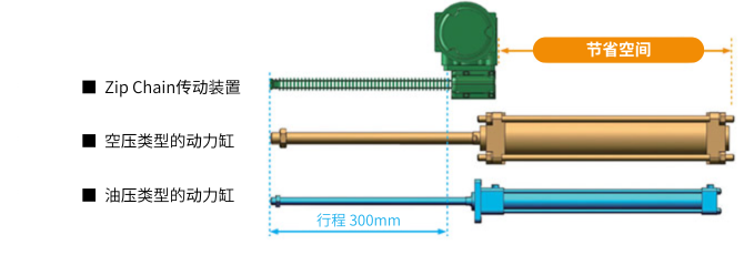 Zip Chain传动装置可以将Zip Chain紧凑地收纳在主体内,从而使其尺寸仅为传统直线作动机的 1/4 到 1/5。