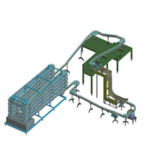 一种树脂链条输送机系统,可将卫生不锈钢框架标准化,并可轻松构建布局。模块化结构,支持多种布局,易于组装。