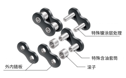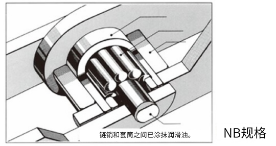 这是 RS 型链条,带有加长销轴和可自由旋转的侧置滚子。