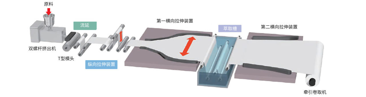 对从T型模具挤出的原料进行冷却、淬伸。