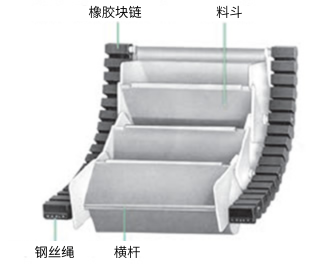 一种容器式输送机,采用带钢绳的橡胶块链和结构独特的铲斗。存储区的前端和后端通过柔性带子连接到下一个存储区,因此连接之间没有间隙。