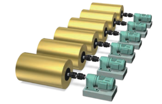 在单个电机驱动多个辊筒的布局中,可以选择蜗轮减速机、MD齿轮箱、膜片联轴器和同步带等组件,并将其集成在一个封装中,以匹配设计。