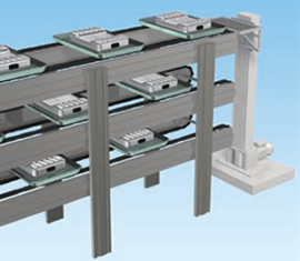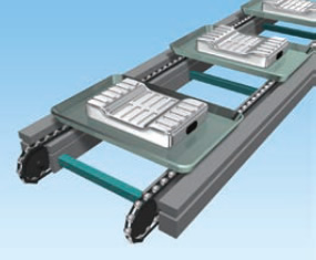 托盘搬运较多的角型、层压型电池的工序间搬运多采用可累加的自由流动链。