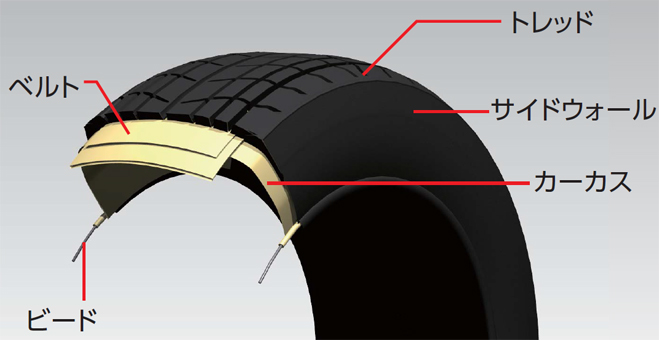 将与路面接触的材料加工成最佳厚度和形状。 - 胎体部分