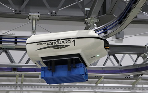 通过在天花板上行走,可有效利用空间,实现高速搬运的搬运设备。