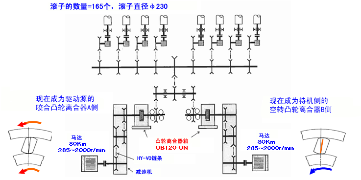 在上图中,左侧的凸轮离合箱A为啮合驱动源,右侧的凸轮离合箱B为啮合驱动源。
