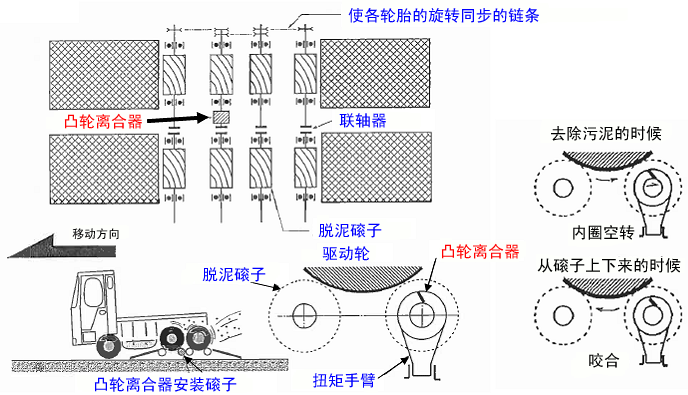后轮向前旋转,利用离心力甩掉泥浆。