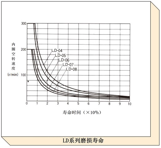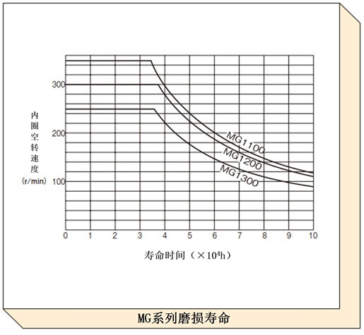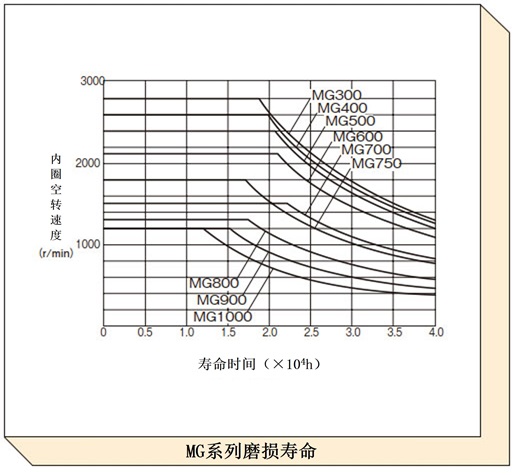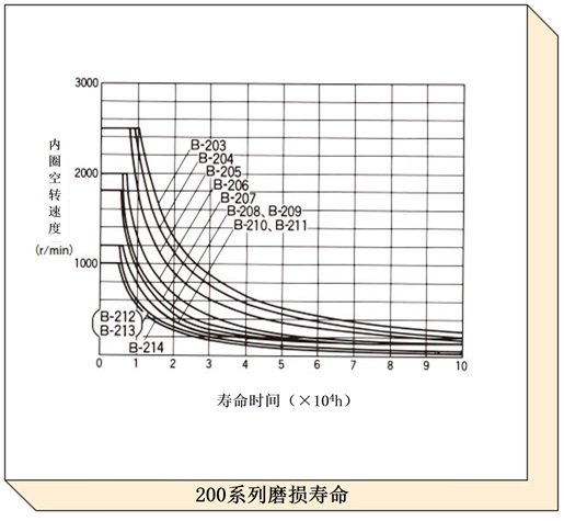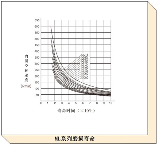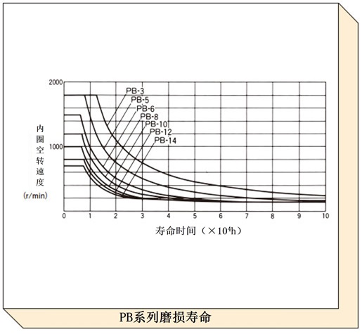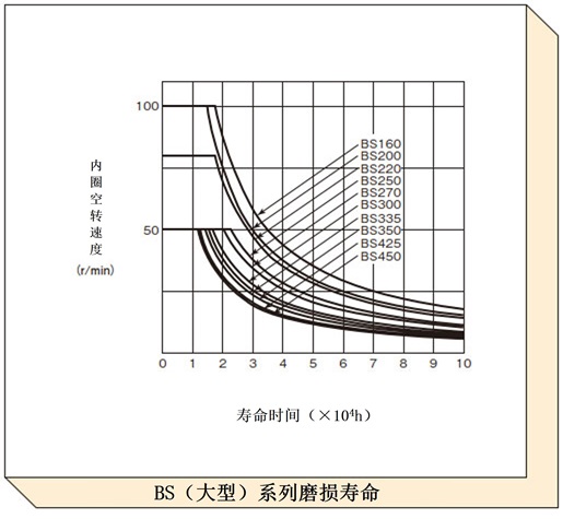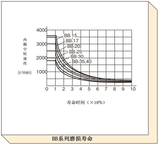 根据润滑条件而变化,磨损寿命曲线表示在普通状态 (如产品目录所记载) 下润滑时的磨损寿命。对于速度较快且空转时间较长的项目,请使用此图表检查预期寿命。