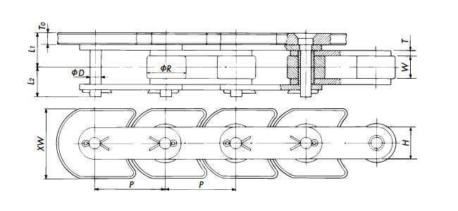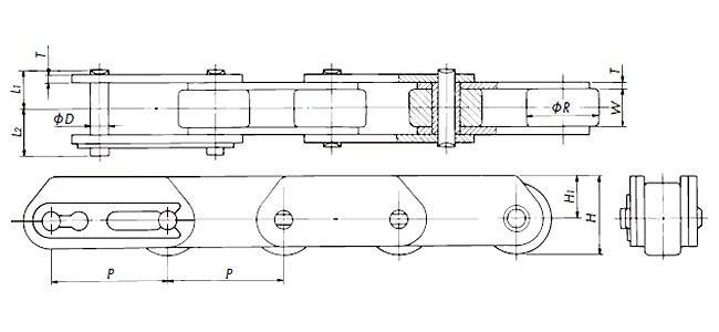 DL 这种双倍节距链条的 H1 尺寸大于滚轮的上表面。即使使用 R 型滚轮,搬运物也可以直接放置在链条上。