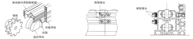 这款倍速链的铝制框架(包括带盖罩的)采用工程塑料作为滚子。 - - 铝合金框架,钢轨