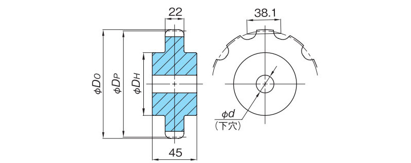 | 型号 | 齿数 | 节距圆直径 DP mm | 外径 Do mm | 轴孔 形状 | 预留孔 mm |