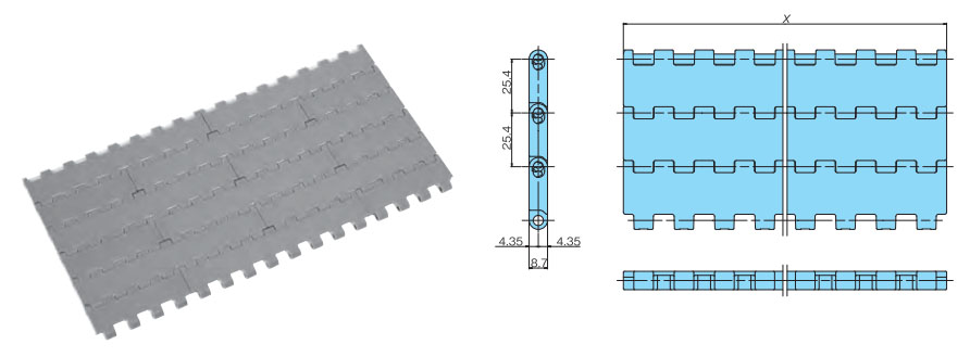 • ・幅広と幅狭のプラスチック製モジュールをレンガ状に組合せ、ワイドな搬送面を実現し大量搬送が可能です。