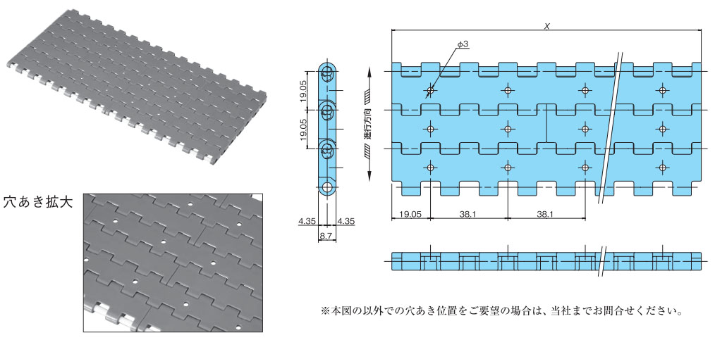 • ・BTC6形の穴あきタイプです。この穴を活用し、搬送物のバキューム搬送に活用いただけます。