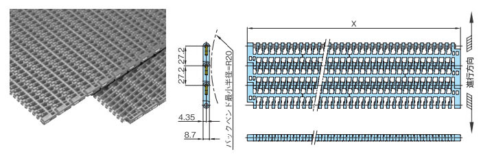 • ・幅広と幅狭のプラスチック製モジュールをレンガ状に組合せ、ワイドな搬送面を実現し大量搬送が可能です。