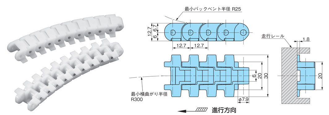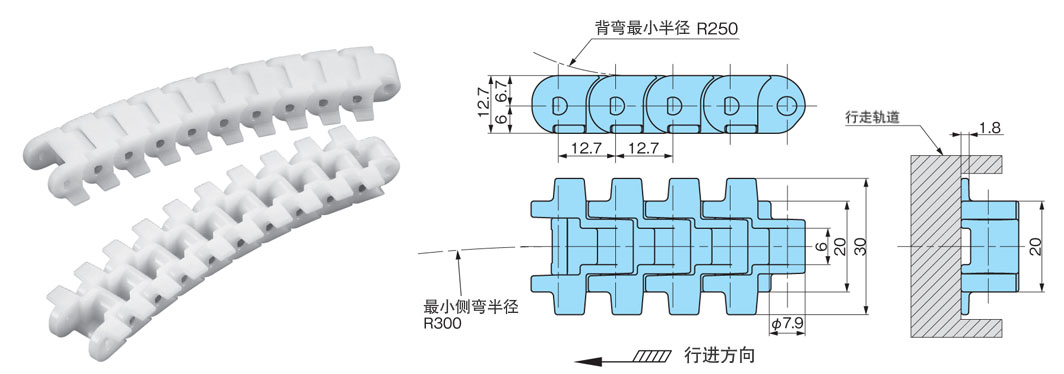 • -链节距为 12.7 毫米,最小侧向弯曲半径R300,从而节省空间。