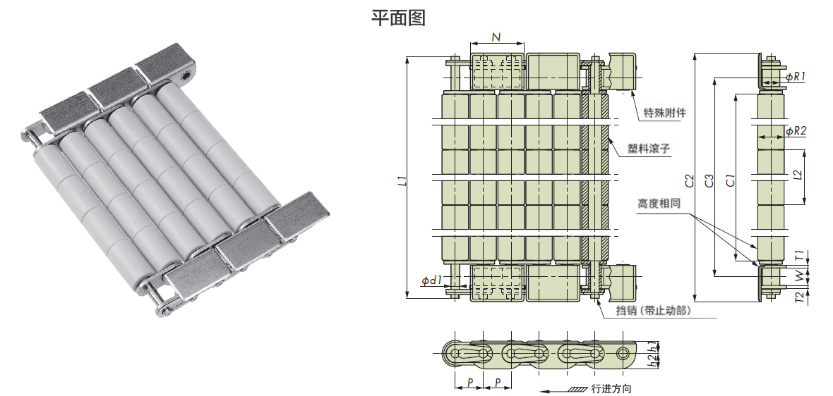 - 特殊的附件和塑料滚子的顶面处于同一高度,这意味着当安装两排平行链条时,很容易从一排链条移动到另一排链条。