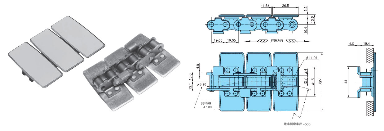 - -防浮起附件的弧形输送链。容许张力比 TTU 型更高。