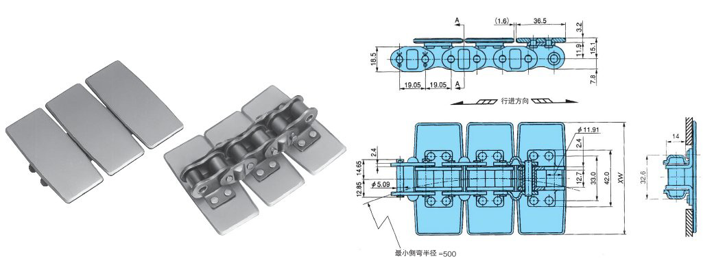 - - 一种弧形输送链,其外板上带有导向凸起,用于横向弯曲。它的容许张力比TTU更高。