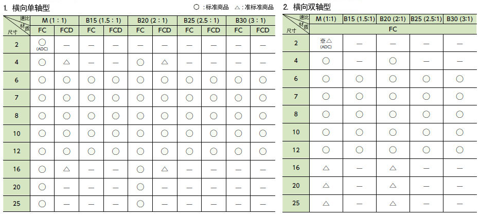 注2) 对于尺寸为2的横向2轴类型,可生产轴配置1-1-UD (-O)、1-1-U (-O)、1-1-D (-O)、U-D-LR (-O)、U-D-R (-O) 和U-D-L (-O) 。