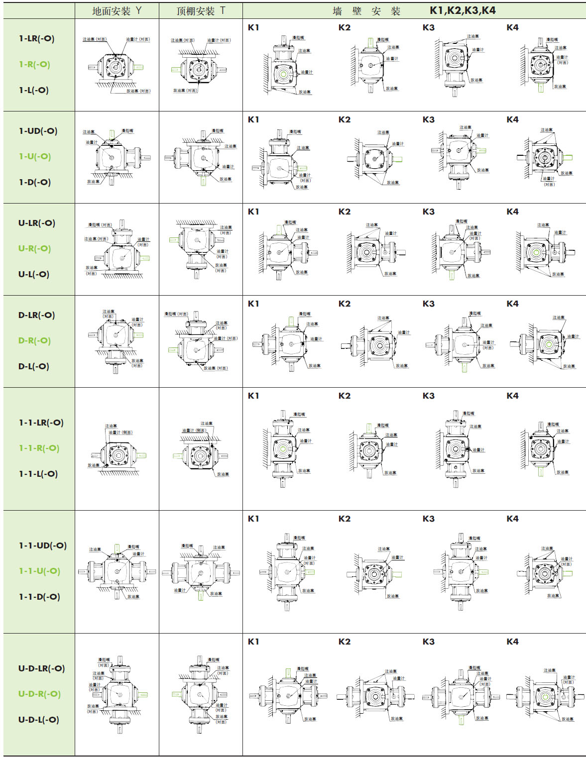 ·尺寸6~25的标准尺寸为地板安装 (Y) 。天花板安装 (T)、墙壁安装 (K1~K4) 时,油尺、插头、脂嘴的位置不同。