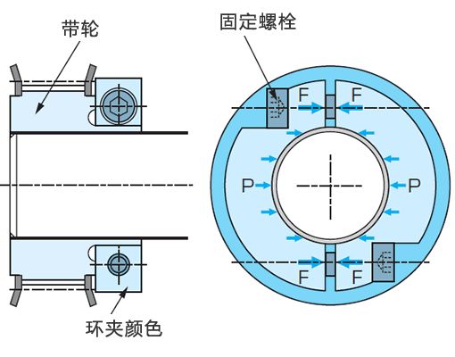 在滑轮轮毂上夹2片夹紧套环,用F力拧紧紧固螺栓后,轮毂的外面四周以相当于4F力的面压P压住