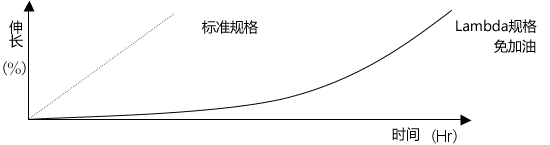 倍速链Lambda规格(免加油)具有以下两个特点。 免加油长时间运行 倍速链Lambda规格免加油即可使用,并且由于特殊含油套筒的作用,使用寿命很长。 低噪音 标准规格倍速链运行速度可达被搬运物速度的1/2.5倍,因此比侧置滚子或顶滚子的链条噪音低15%。然而,如果标准规格倍速链长时间免加油,销轴和衬套之间会产生尖锐的摩擦声。倍速链Lambda规格(免加油)采用含油衬套,确保销轴和衬套之间均匀分布适量的润滑油,从而防止产生摩擦声,并长时间保持静音运行。