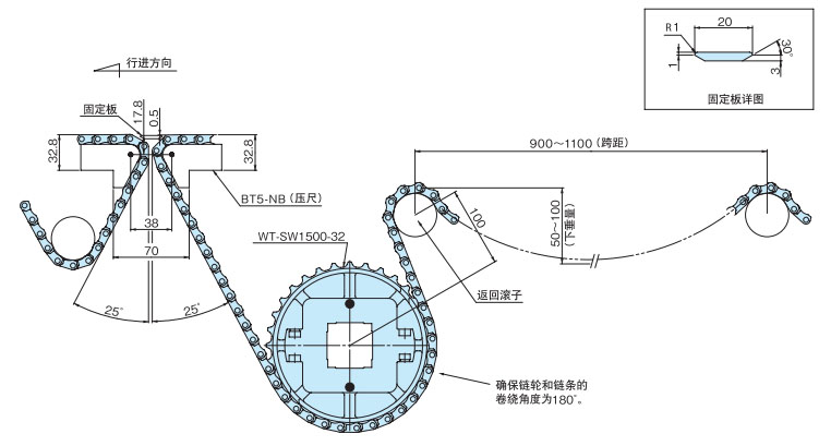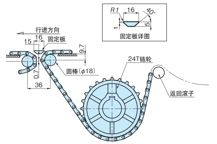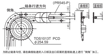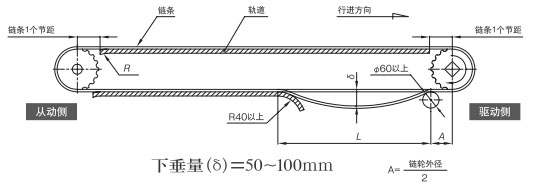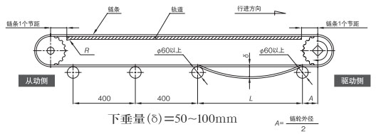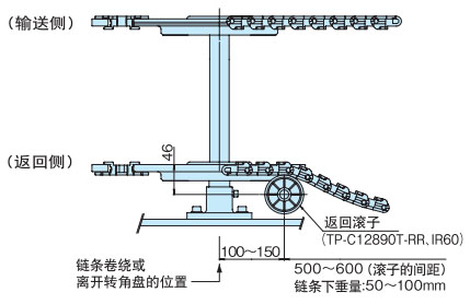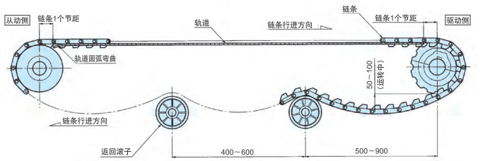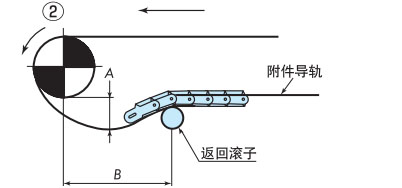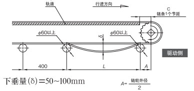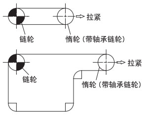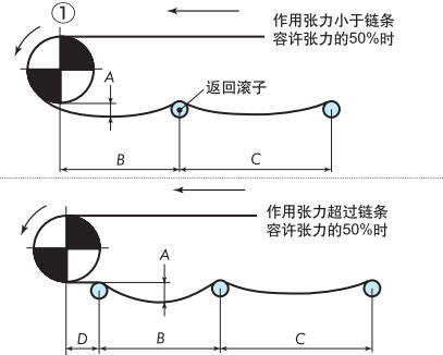 作为最普通的布局,返回辊接收的方法是推荐的。在回位滚子的固定方式中,可以设置适当的链条松弛部分,可以吸收链条伸长,因此推荐使用。如果带有翼板,则需要防止翼板与滚子发生干涉。
