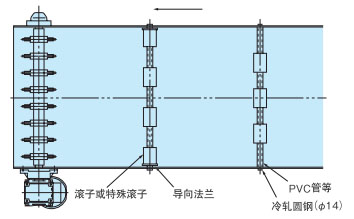 正反底部驱动时,约1.5倍使用张力的负荷会作用于惰轮辊部,因此使用机械宽度较大的输送机 (1m以上) 时,请选择刚性足够的轴,或采用3个点以上支撑的方式承受轴。