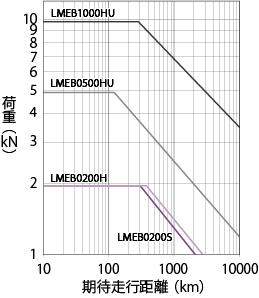 | A14 | Lift Master的预期寿命取决于螺钉的预期使用寿命。 梯形螺杆型(LMEM) 当总运行距离达到 5 公里时,无论起重载荷如何(参考值),即可确定预期寿命。滚珠丝杆式(LMEB) 滚珠丝杆的寿命取决于滚动表面因疲劳而产生的剥落现象。请查看下图中的大致寿命。但是,如果受到较大冲击,或者没有进行适当的润滑和保养,则预期运行距离将大幅减少。 预计运行距离(公里)= 实际负载行程(米)× 使用频率(次/天)× 运行天数/年 ×10-3 × 预计年数 预期寿命因升降负荷而异。行程途中负荷大幅变动时,请按下式计算当量负荷。 PM = PMIN + 2 × PMAX3 P M:当量载荷N P MIN:最小载荷N P MAX:最大载荷N ・此图显示了根据滚珠丝杆的 L10 寿命(90% 或以上总寿命将达到的寿命)计算运行距离。- 如果受到多次撞击,或者没有进行适当的润滑和维护,预期运行距离将会大幅减少。 ・如果需要更长的使用寿命,我们将考虑更换滚珠丝杆以适应负载条件。 ![]() |