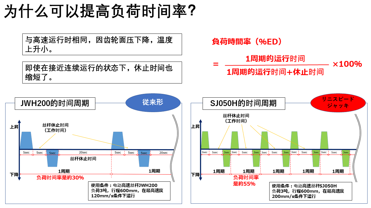 | A4 | 与上一节所述原因相同,Linispeed千斤顶的发热量受到抑制,因此,如果使用两个5吨级的框架,电动高速丝杆产生的热量更少,停机时间也更短。这使得其负载持续率高于传统千斤顶。 |