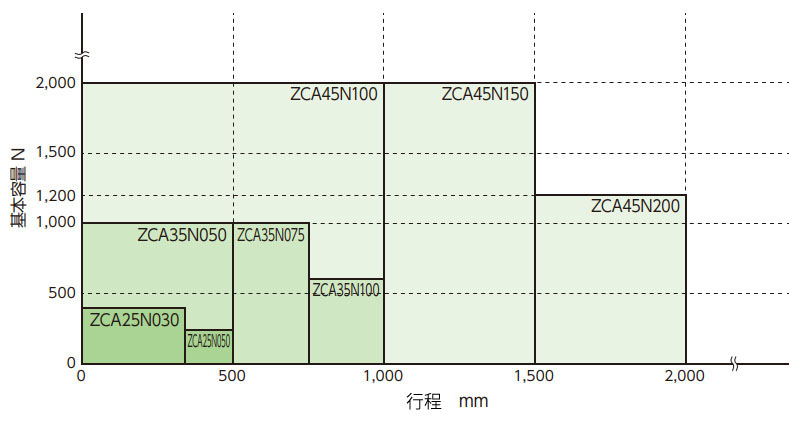 下图显示了笔划和基本容量之间的关系。请在此图表中确认每台ZCA的所需推力和使用行程,确定型号。