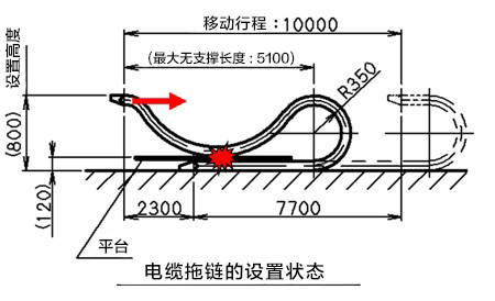 电缆拖链的移动端和安装高度均高于我们推荐的值。 因此,过大的弯矩作用于自由跨部分。 |