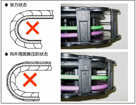 内周侧的电缆软管被挤压,过度的压缩力反复作用。 |